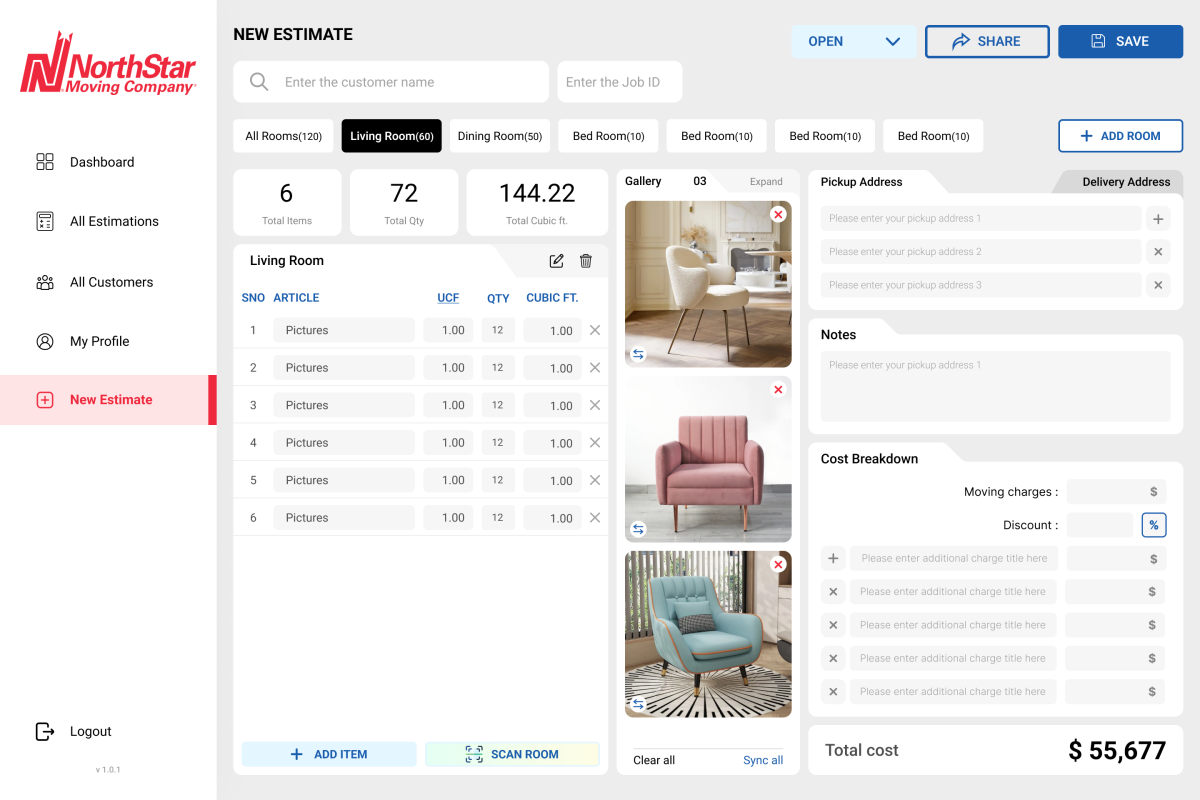 Traditionally, moving estimations relied on manual measurements, handwritten notes, photos, and spreadsheet-based calculations—often leading to inconsistent pricing, estimation errors, and repeated site visits. NorthStar modernizes this workflow by allowing estimators to measure rooms and objects digitally (including AR-based measurements), calculate volumes in cubic feet, and generate professional PDF estimations directly from the field.