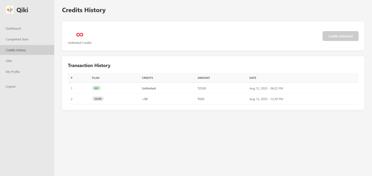 Qiki includes an integrated payment gateway that enables monetization through a credit-based access model. Users can purchase credits, where 1 credit unlocks 1 quiz, ensuring a simple and transparent rule for access. The platform also supports guest mode, allowing users to explore and participate without full registration when trial access is required.