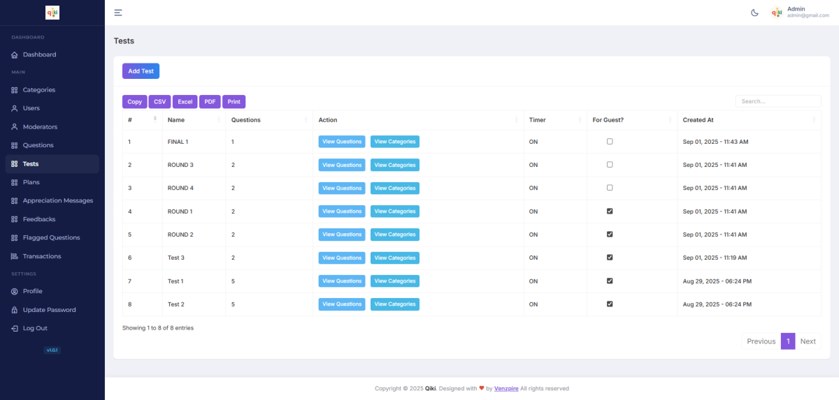 The admin and moderator panel powers the content management layer of Qiki by handling all quiz configuration tasks. From this dashboard, teams can import or upload questions, organize them into quizzes, and manage what content becomes available to end users. This setup keeps quiz creation centralized while enabling smooth collaboration between multiple roles.