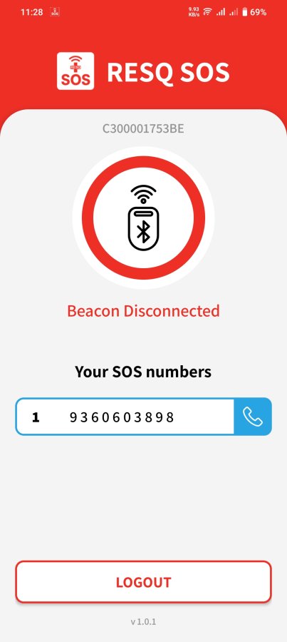 Employees log in using credentials provided via email and can view their assigned beacon and emergency contacts. When an SOS is triggered from the beacon, the app receives the signal, raises an alarm, notifies the backend, and automatically dispatches SMS alerts to three emergency numbers—ensuring immediate escalation.